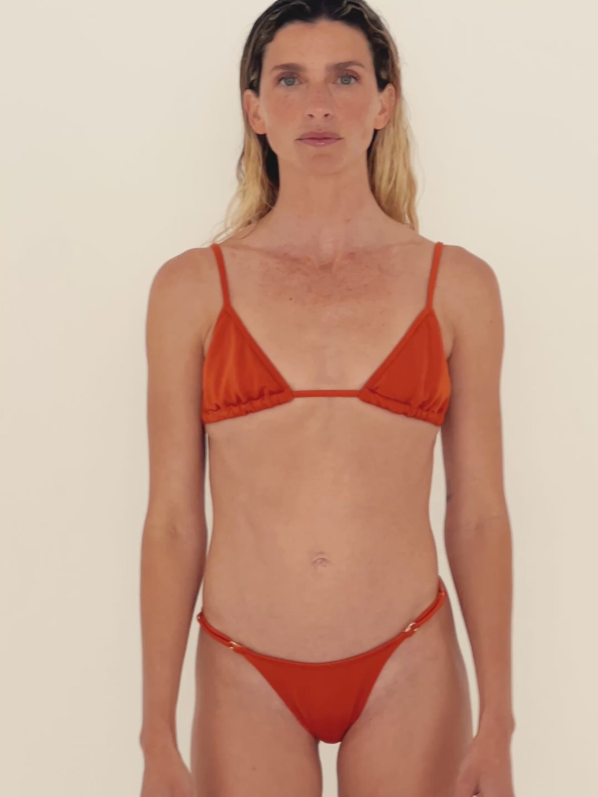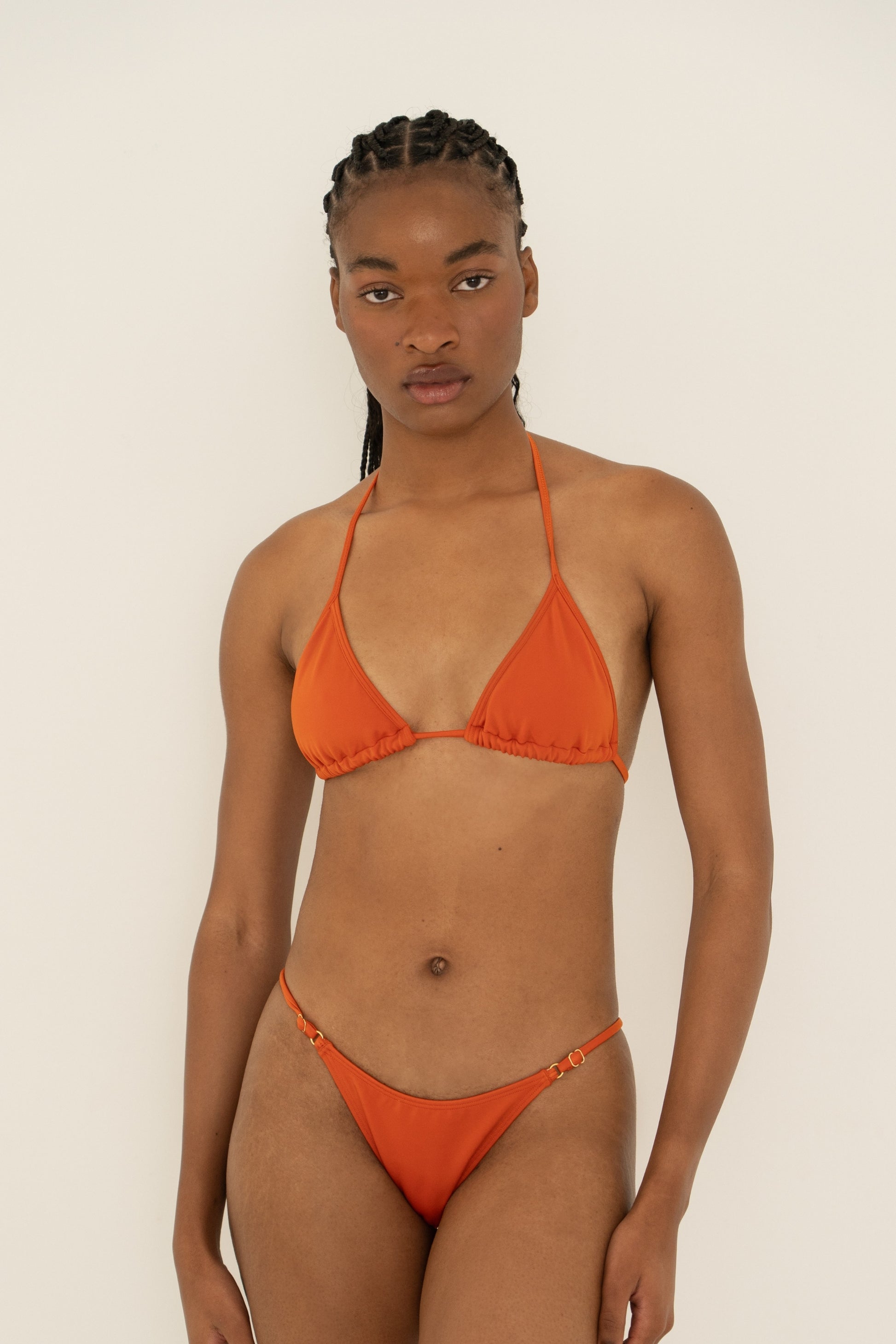 O modelo "Sol Nascente" apresenta o clássico triângulo com regulagem, ideal para quem valoriza liberdade de movimentos e um bronzeado uniforme. A calcinha com fitas finas e ajustáveis realça a silhueta com leveza e discrição. Um conjunto pensado para evidenciar a beleza natural com delicadeza e confiança.