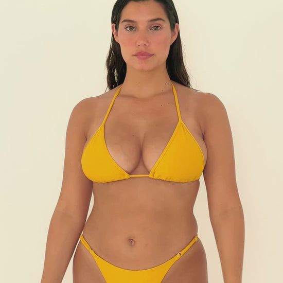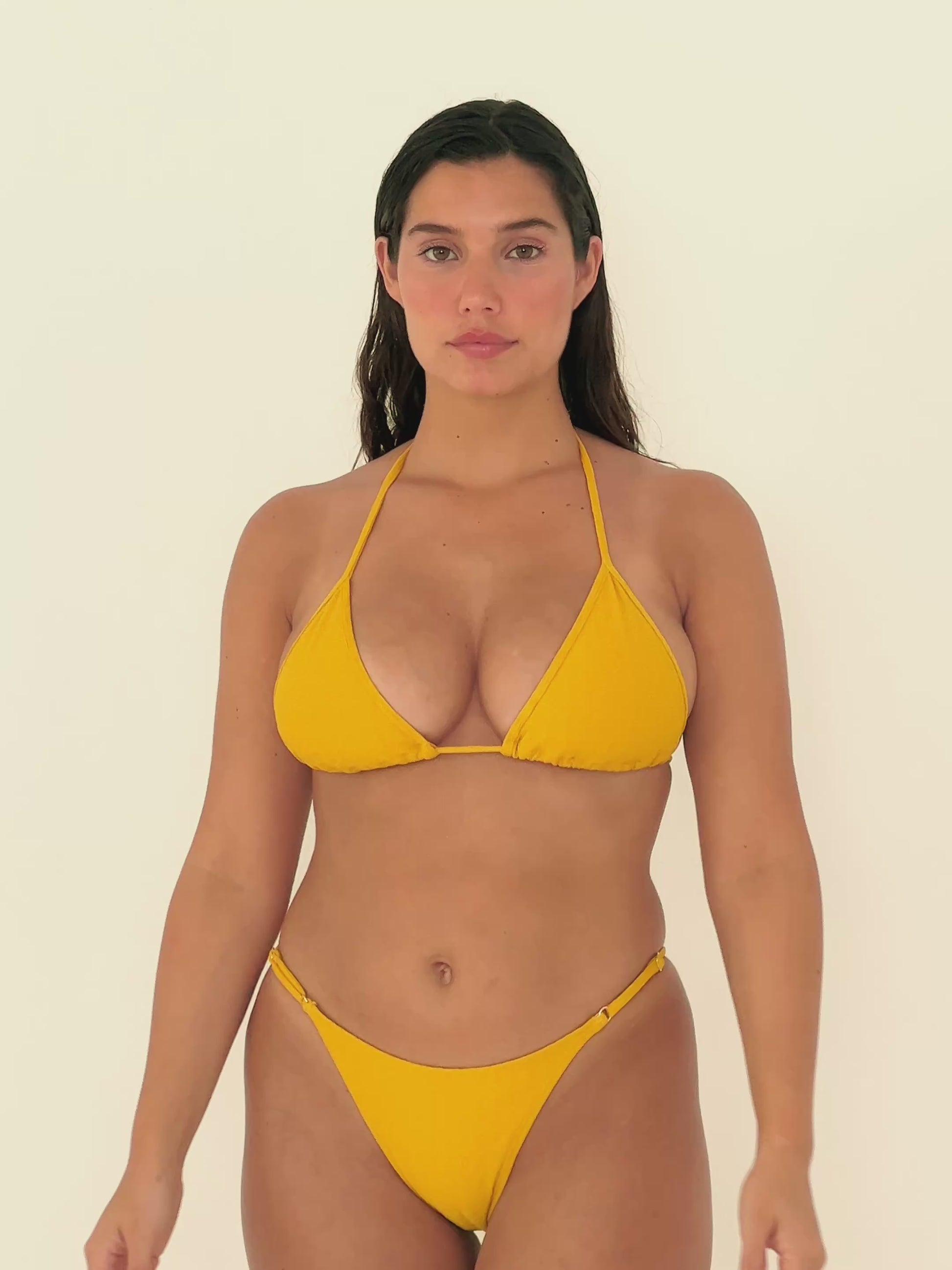 O modelo "Sol Nascente" apresenta o clássico triângulo com regulagem, ideal para quem valoriza liberdade de movimentos e um bronzeado uniforme. A calcinha com fitas finas e ajustáveis realça a silhueta com leveza e discrição. Um conjunto pensado para evidenciar a beleza natural com delicadeza e confiança.